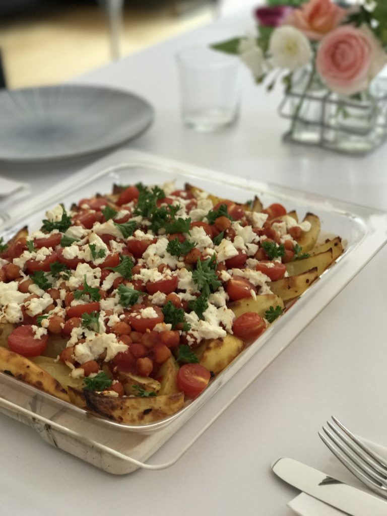 Spread the “tomato-chickpea-harissa“ mixture on top of the potatoes. Crumble the Feta cheese on top.